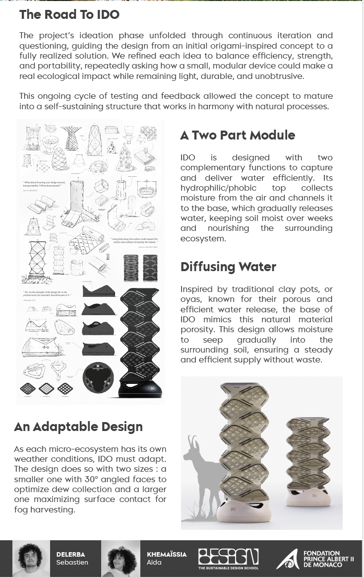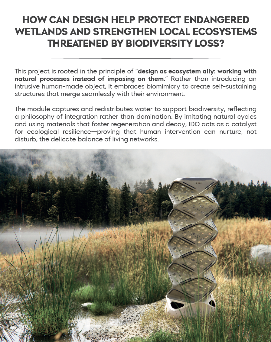 An autonomous module, inspired by biomimicry, captures and redistributes water to protect endangered wetlands and strengthen local ecosystems threatened by biodiversity loss. Designed to be durable, discreet, and easily transportable, it consists of an upper part that captures humidity from the air and channels it to its base, and a base, inspired by traditional clay pots, that allows water to gradually infiltrate into the surrounding soil, ensuring a constant and efficient supply, without waste.