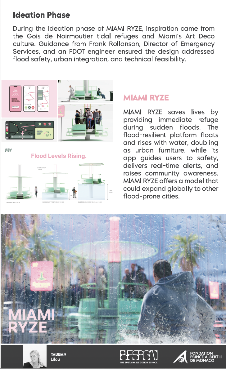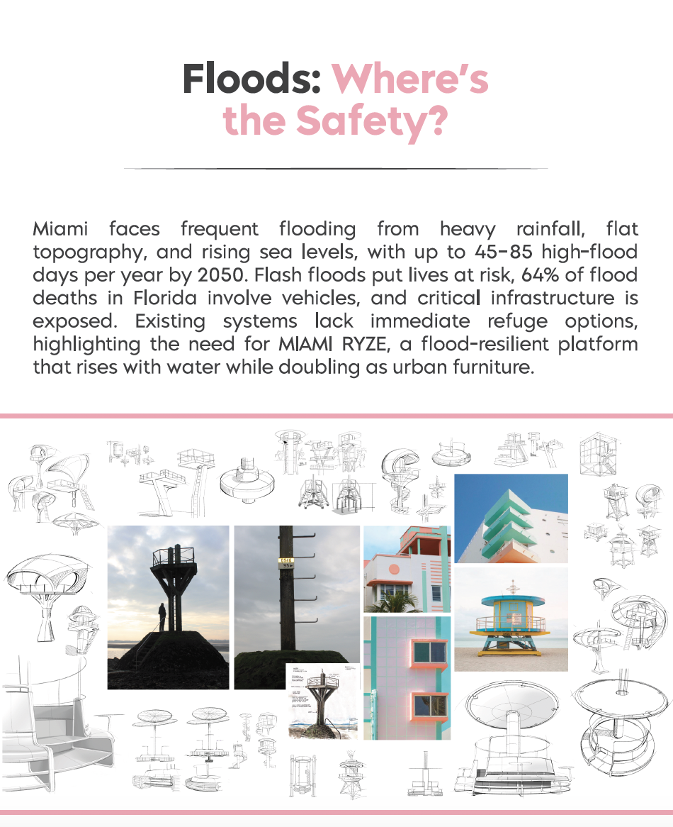 Inspired by the submersible causeway of the Passage du Gois in Noirmoutier and Miami's Art Deco culture, Miami Ryze street furniture aims to save lives by providing shelter in the event of flash floods. This flood-resistant platform rises and falls with the water level to safely guide residents who are previously guided to available platforms via an app that broadcasts real-time alerts.