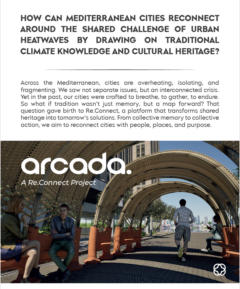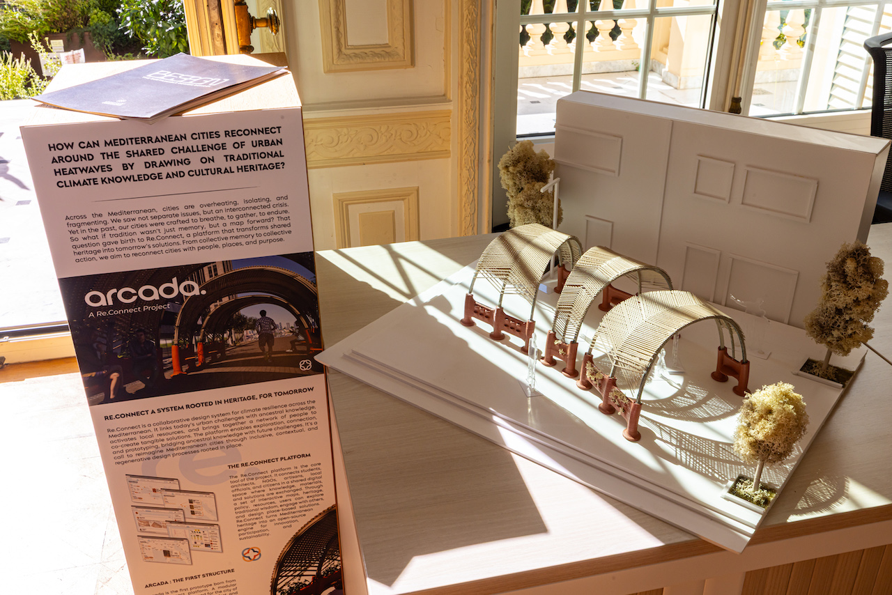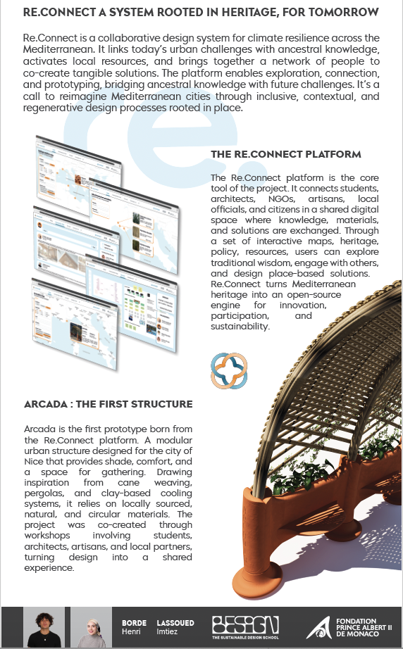 The Re.Connect platform is a tool that connects students, architects, NGOs, artisans, local elected officials, and citizens in a shared digital space where knowledge, resources, and solutions related to innovation and sustainable development are exchanged to promote climate resilience in the Mediterranean. This networking initiative aims to co-create concrete solutions, the first of which is called Arcada, a set of modular urban structures designed for the city of Nice to address the challenge of urban heatwaves. Comprised of pergolas inspired by cane weaving and clay-based cooling systems, Arcada draws on local, natural, and circular materials typical of the Mediterranean to provide shade, comfort, and a welcoming atmosphere.