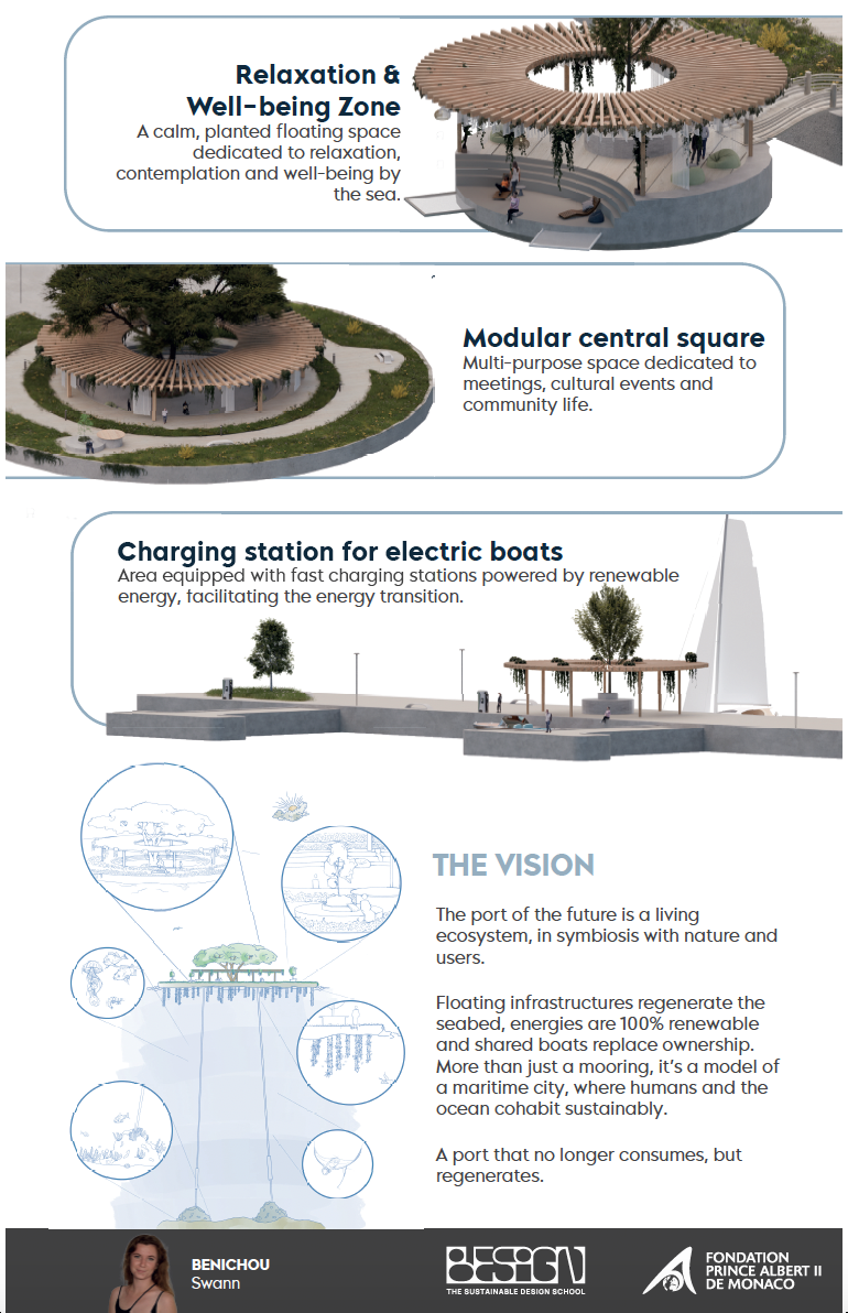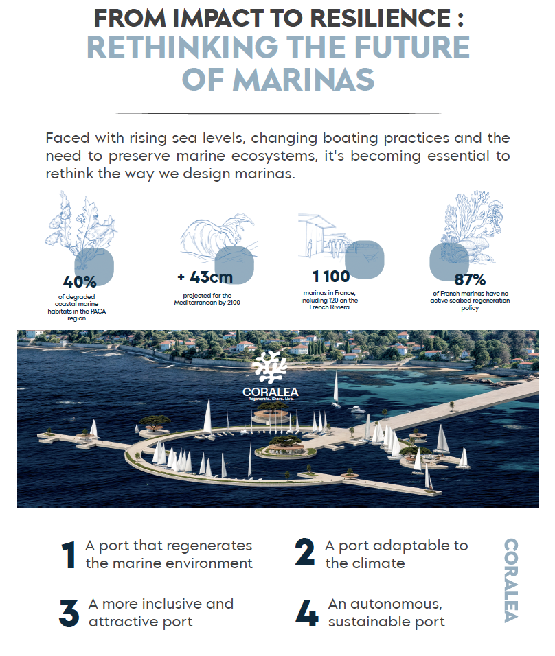 More than just a mooring, Coralea embodies a model of a maritime city where people and the ocean coexist harmoniously: an autonomous and sustainable port, designed with floating infrastructure, that regenerates the seabed, adapts to the climate, and offers inclusive and attractive spaces (a planted wellness area, a multipurpose space dedicated to meetings, cultural events, and community life, charging stations for electric boats powered by renewable energy, etc.).