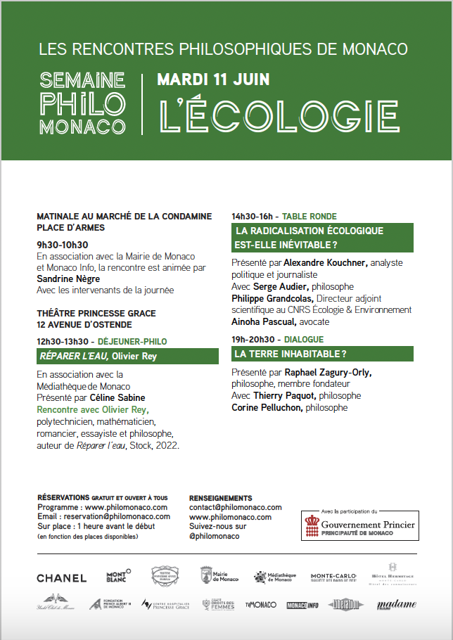 A philosophy lunch with Olivier Rey on the theme of ‘Repairing Water’ will follow from 12:30 p.m. to 1:30 p.m. at the Princess Grace Theatre in association with the Monaco Media Library. The two afternoon round tables will focus on ‘Is ecological radicalisation inevitable?’ (2:30 p.m. to 4:30 p.m.) and ‘An uninhabitable Earth?’ (7 p.m. to 8:30 p.m.).