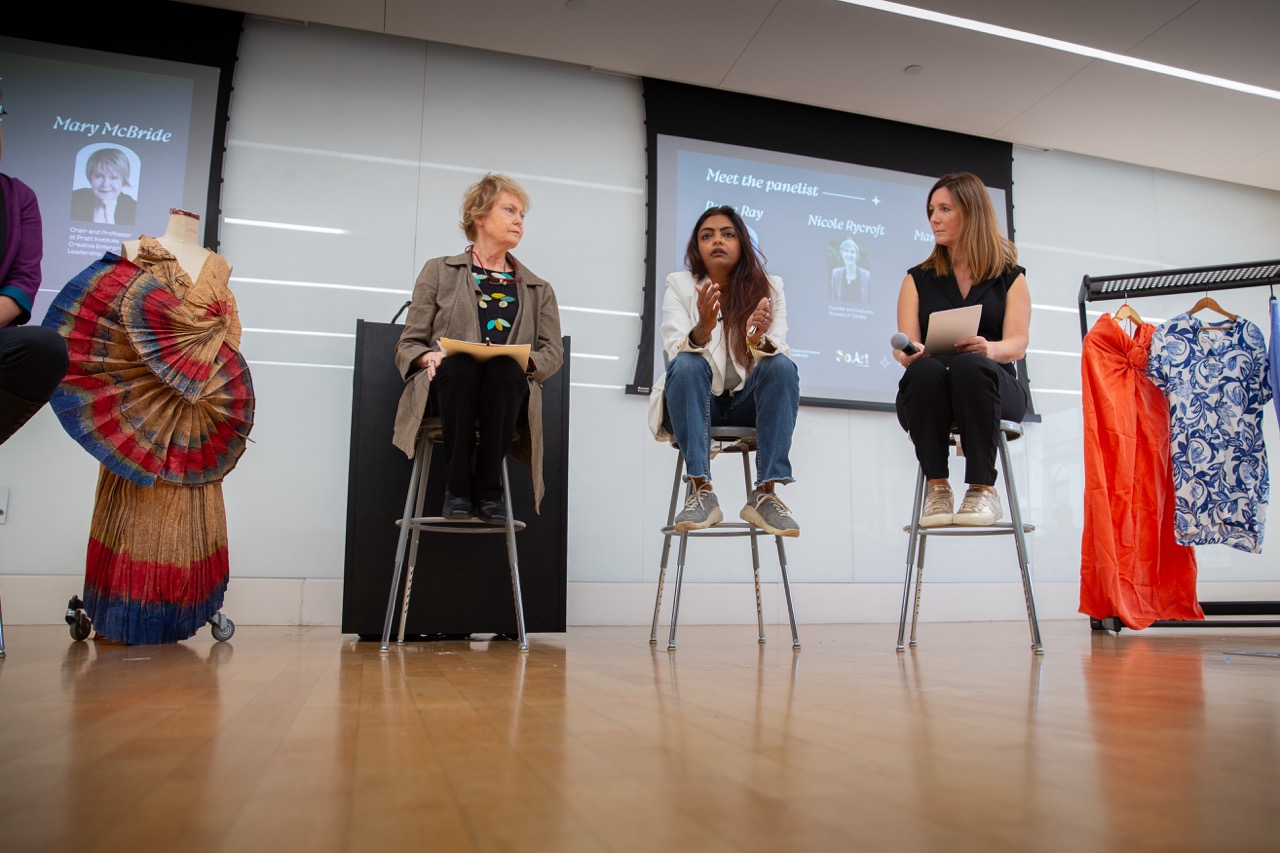 Face à un public d’étudiants en art, mode, design et en management culturel mais aussi de professionnels du secteur, Runa Ray, créatrice et fondatrice de Fashioning for Social & Environmental Justice, Nicole Rycroft, fondatrice et directrice exécutive de Canopy, et Dr Mary McBride, présidente et professeure au Pratt Institute Creative Enterprise Leadership ont adressé les enjeux de durabilité, de circularité et d’inclusivité dans le secteur de la mode.