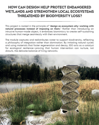 Un module autonome, inspiré du biomimétisme, capte et redistribue l'eau pour protéger les zones humides en danger et renforcer les écosystèmes locaux menacés par la perte de biodiversité. Conçu pour être durable, discret et facilement transportable, il est composé d’une partie supérieure qui capte l'humidité de l'air et la canalise vers sa base, et d’un socle, inspiré des pots en argile traditionnels, qui permet à l’eau de s'infiltrer progressivement dans le sol environnant, assurant ainsi un apport constant et efficace, sans gaspillage.