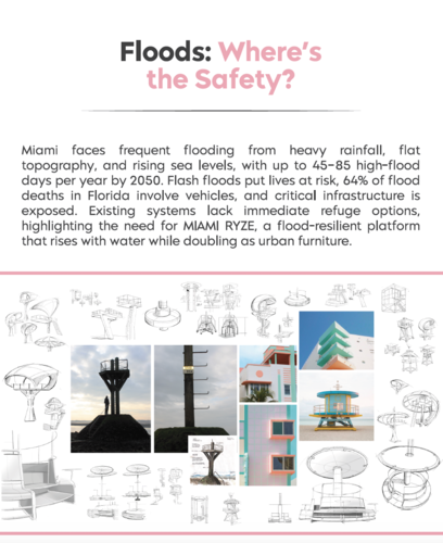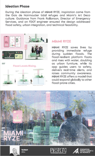 Inspiré de la chaussée submersible du passage du Gois à Noirmoutier et de la culture Art déco de Miami, le mobilier urbain Miami Ryze vise à sauver des vies en offrant un refuge en cas de crues soudaines. Cette plateforme résistante aux inondations se soulève et s'élève avec le niveau de l'eau pour mettre en sécurité les citoyens guidés au préalable vers les plateformes disponibles grâce à une application qui diffuse des alertes en temps réel.