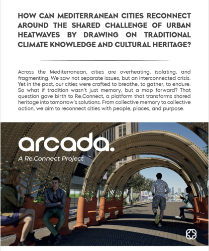 La plateforme Re.Connect est un outil qui met en lien étudiants, architectes, ONG, artisans, élus locaux et citoyens dans un espace numérique partagé où s'échangent connaissances, ressources et solutions liées à l’innovation et au développement durable en faveur de la résilience climatique en Méditerranée. Une mise en réseau dont l’objectif est de co-créer des solutions concrètes, et dont le premier-né se nomme Arcada, un ensemble de structures urbaines modulaires conçues pour la ville de Nice afin de répondre au défi des canicules urbaines. Constituée de pergolas s’inspirant du tressage de canne et des systèmes de refroidissement à base d'argile, Aracada s'appuie sur des matériaux locaux, naturels et circulaires, typiques de la Méditerranée, pour offrir ombre, confort et convivialité.